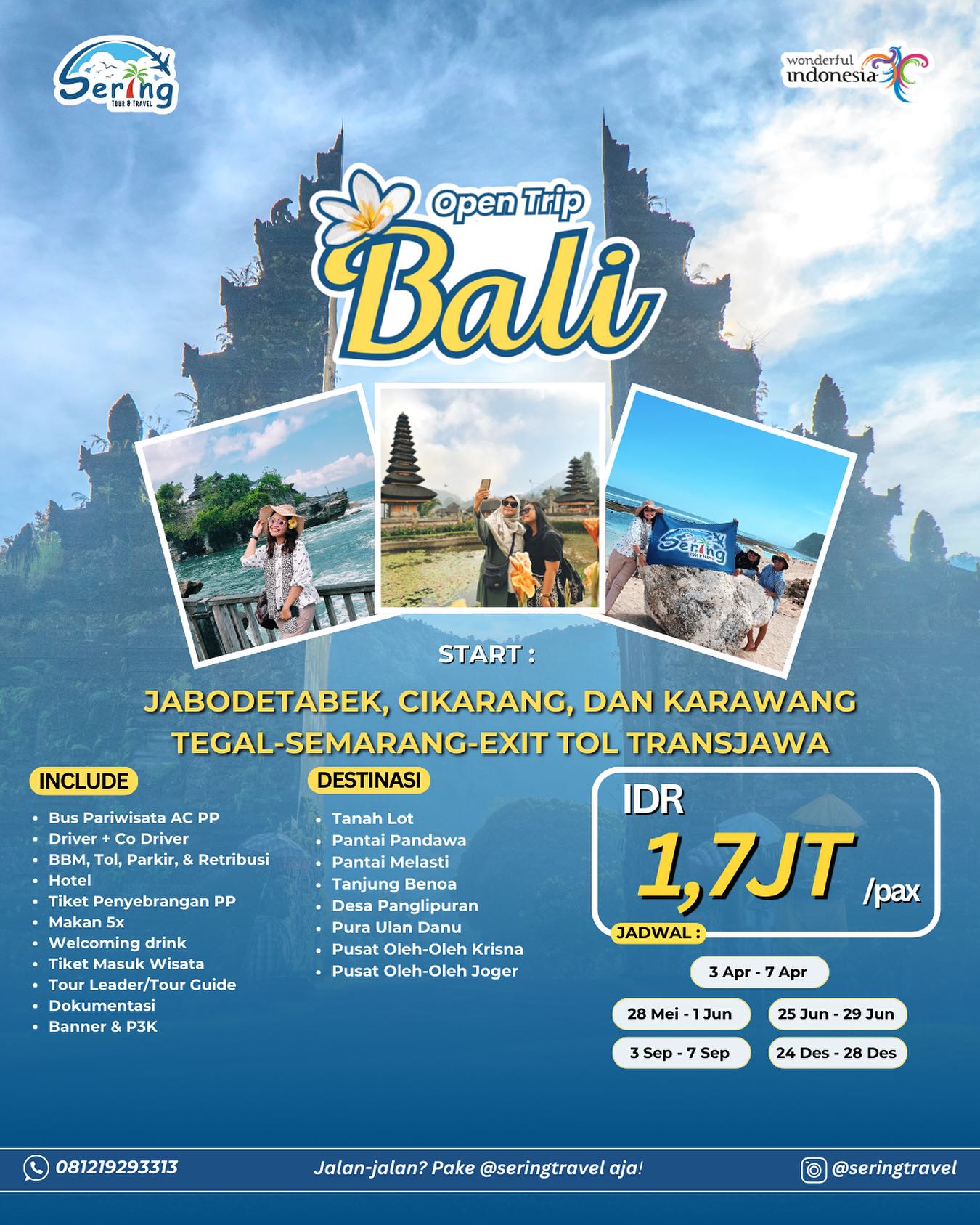 DESTINASI: – Tanah Lot – Tanjung Benoa – Pantai Pandawa – Pantai Melasti – Desa Panglipuran – Pura Ulan Danu – Pusat Oleh-Oleh Joger – Pusat Oelh-Oleh Krisna